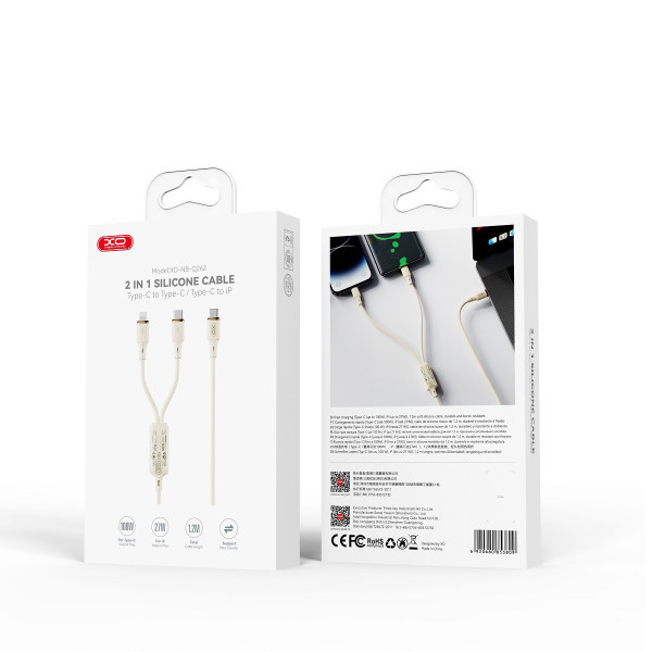XO kabl za telefon 2u1 USB-C - Lightning + USB-C 1,2m BEIGE 60W - brzo punjenje, fleksibilni silikon, elegantan bež dizajn, dugotrajan i prenosiv.